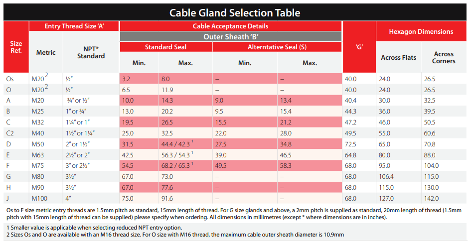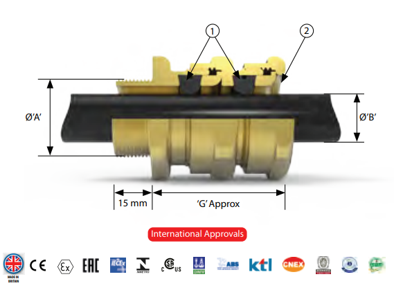 - Two Independent Elastomeric Exd flameproof seals on cable outer sheath – The double seals provide superior cable retention over standard unarmoured Cable Glands