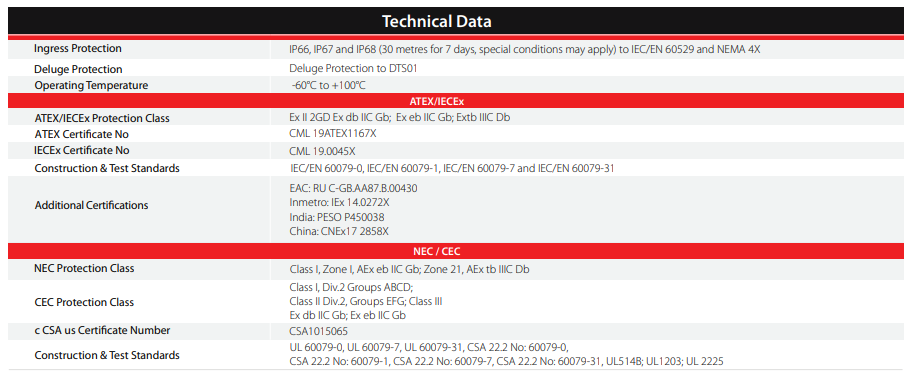 Flameproof, Increased Safety, Dust Protection Class - Zones Certified ATEX / IECEx / c CSA us
