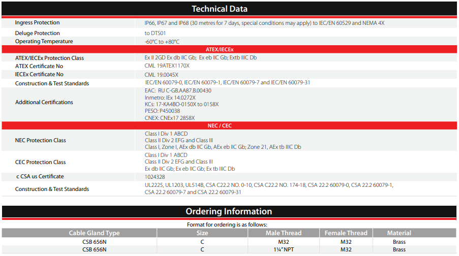 The Dual certified Exe/Exd CSB656N cable gland offers an inspectable barrier